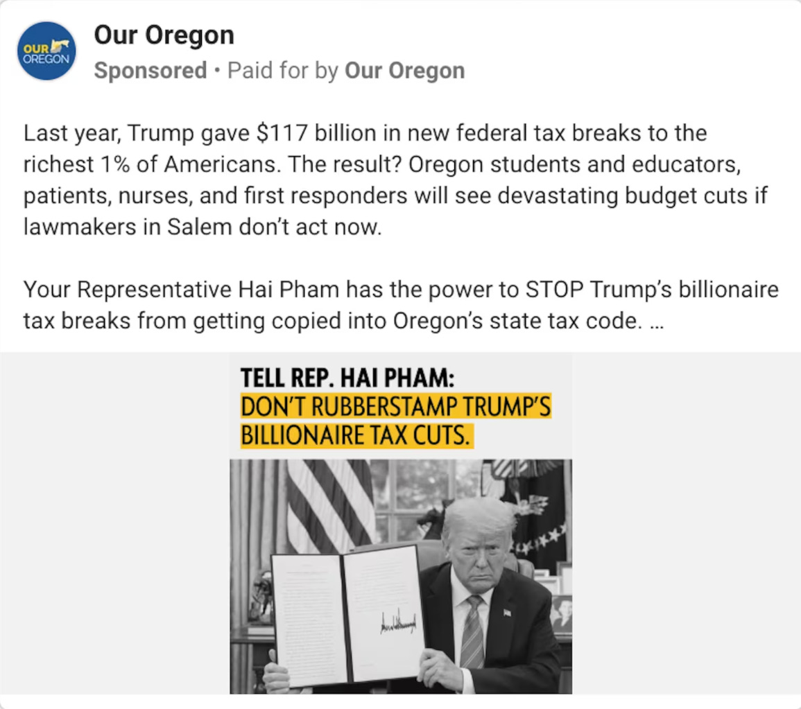 Our Oregon, an Oregon nonprofit dominated by public employee unions SEIU 503, Oregon Education Association and AFSCME, is, as reported by Oregon Public Broadcasting, running ads urging voters to contact four moderate Democratic legislators to demand they vote to disconnect Oregon’s tax code from the federal version, which could raise around $888 million in income taxes on Oregonians over the next two years.