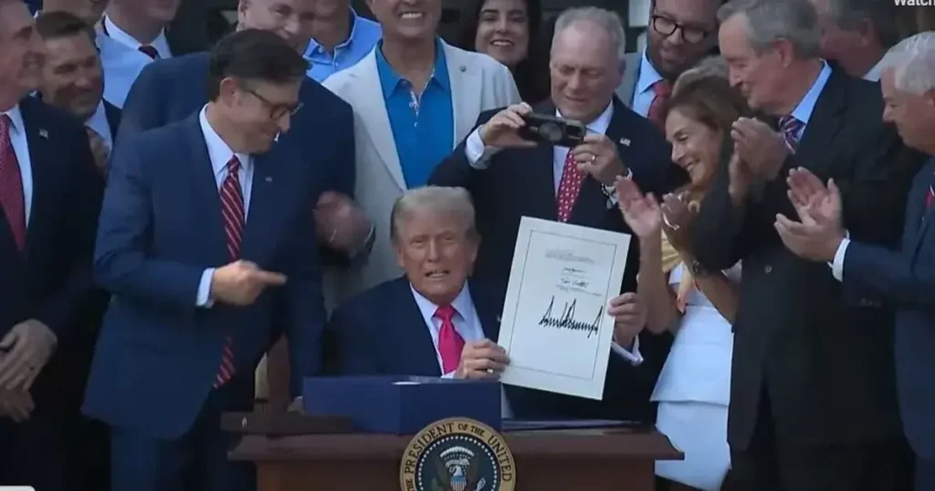 Trump and Republican congressional members delivered on the president’s July 4th deadline for the bill. The bill signing was preceded by a spectacular flyover of military planes, including B-2 stealth bombers, as the White House hosted members of the military and their families on the South Lawn.